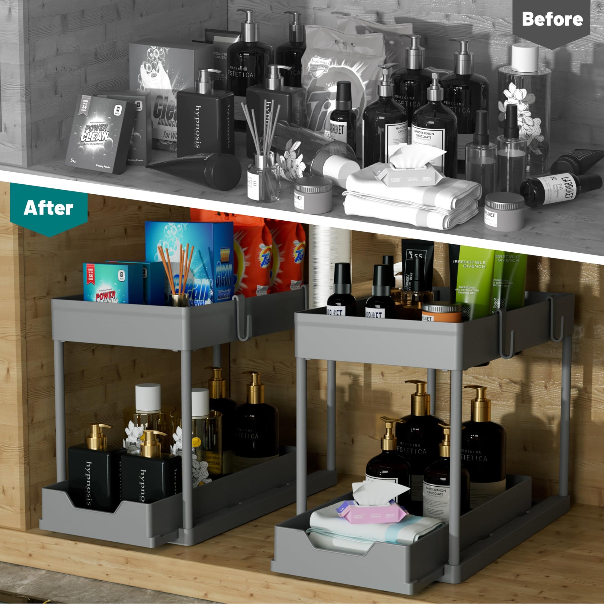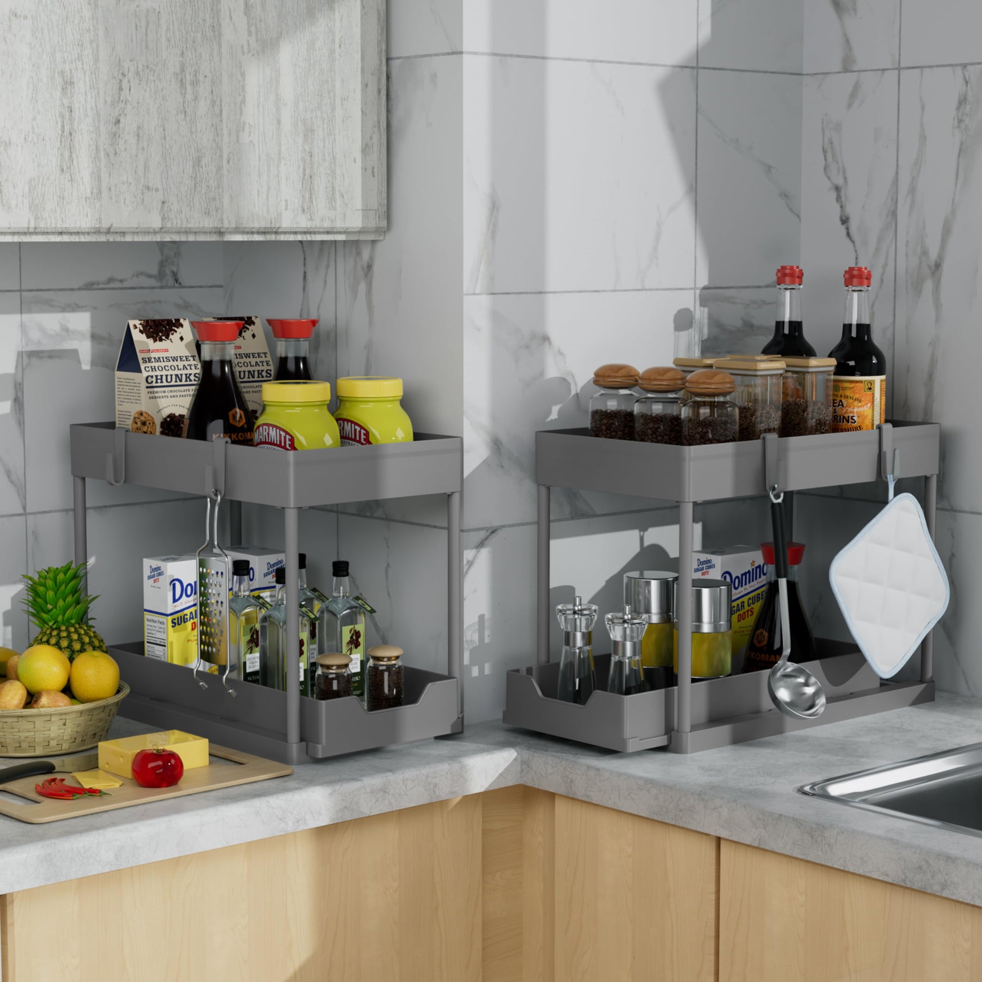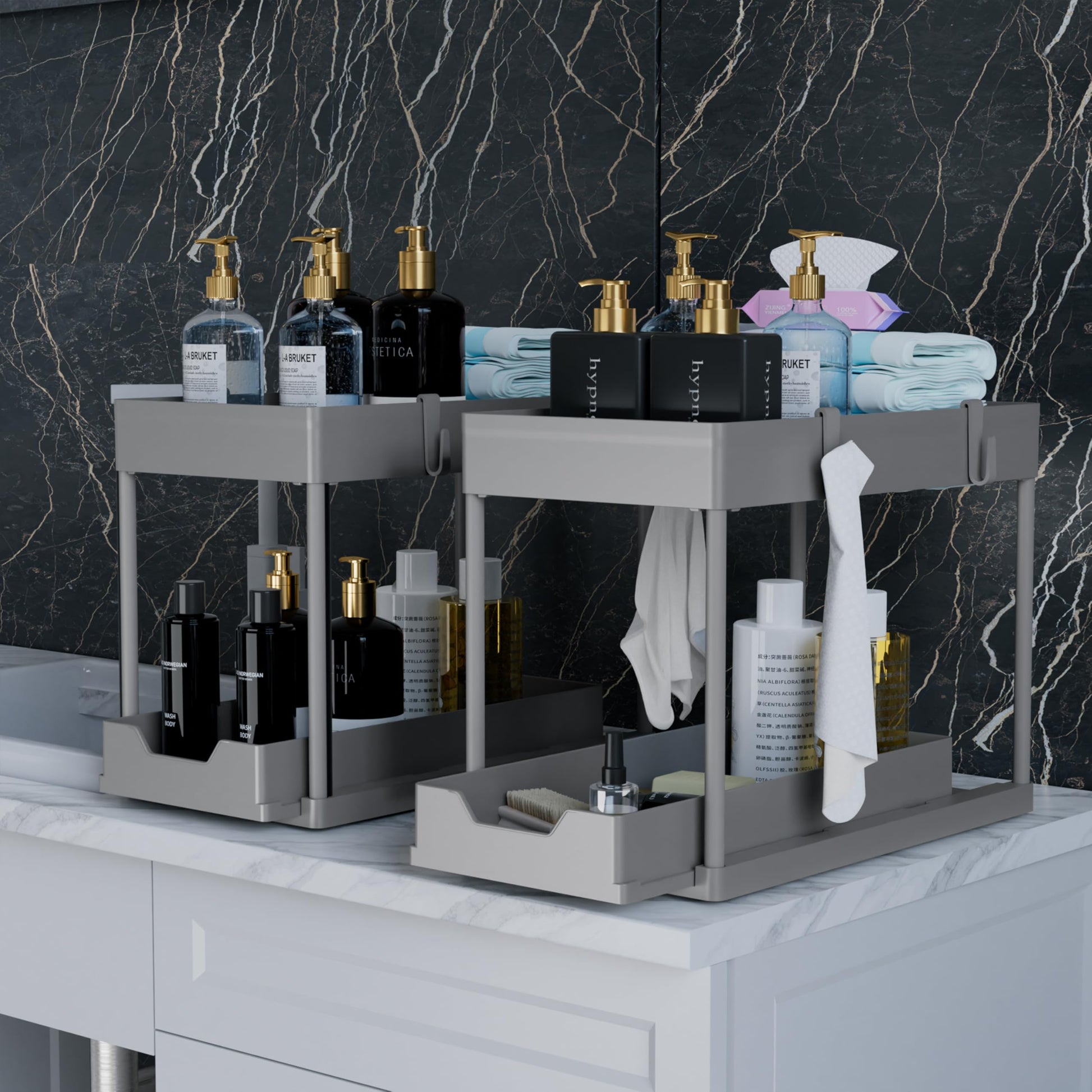 DEKAVA 2-Pack Under Sink Organizer – 2-Tier Sliding Bathroom Cabinet Baskets (Grey)