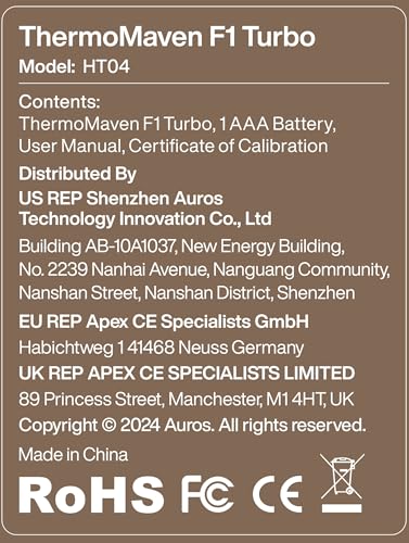 - WHAT YOU GET: ThermoMaven F1 Turbo thermometer, 1 AAA battery, a calibration certificate, a user manual, and friendly lifetime customer support.