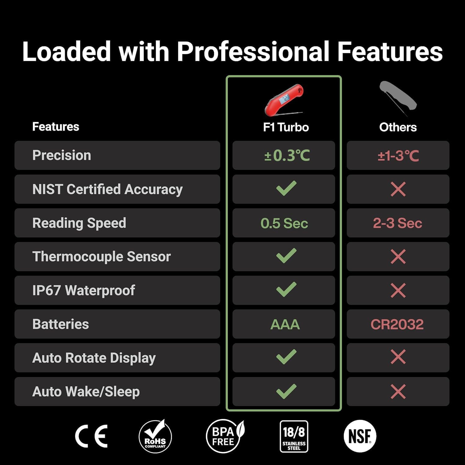- 3X Faster 0.5s Readings: With cutting-edge Thermocouple applied, ThermoMaven F1 Turbo instant read meat thermometer delivers speedy readings in just 0.5 seconds, 3X faster than the competitors, ensuring you always keep up with best cooking results.