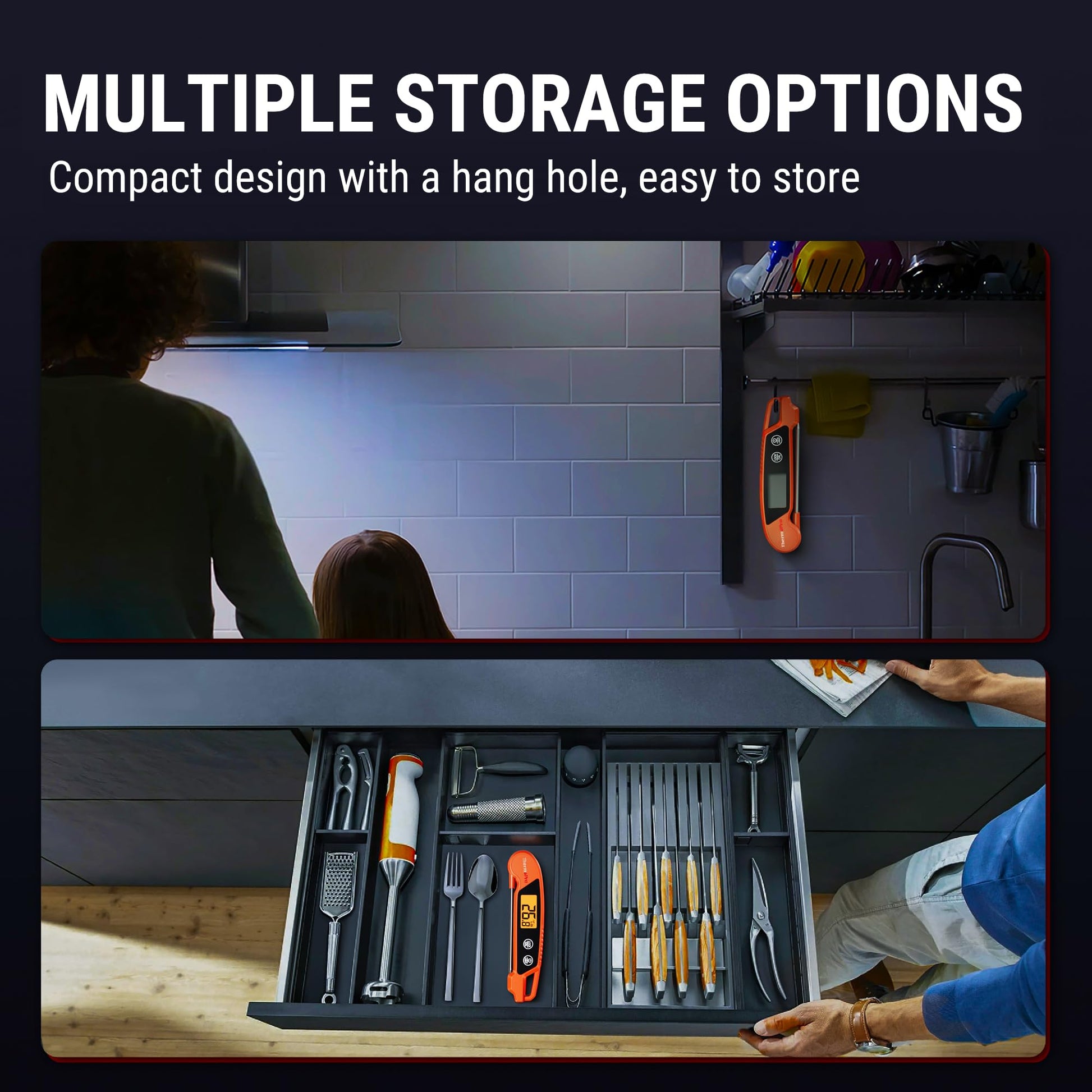 - Clear backlight LCD display: The cooking thermometer features a large backlight LCD display is able to provide the clear readout in dim condition or even in the middle of smoke! Foldable probe design enables this food thermometer easy to hold and store.